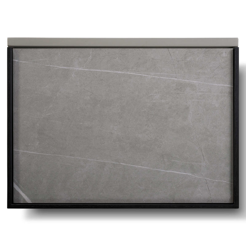 Прикроватная тумбочка от итальянского бренда Fratelli Barri. Столешница изготовлена из серого искусственного камня под мрамор, корпус в отделке шпоном дымчатого дуба, фасады ящиков — серым матовым лаком, ножки — из массива ясеня.