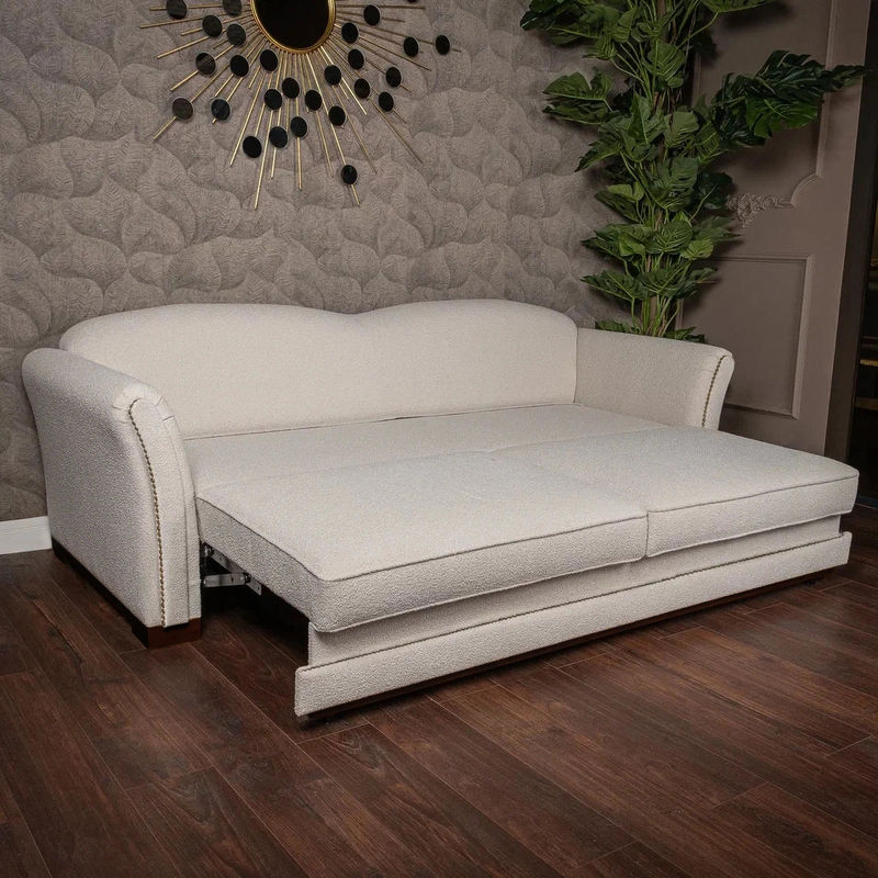 Дизайн дивана дополнен декоративными гвоздиками в отделке состаренное золото.