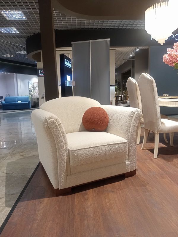 Обивка - ткань из ассортимента фабрики в белых тонах. Тип ткани - букле. Ножки из массива дерева, тонированы под орех.