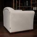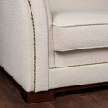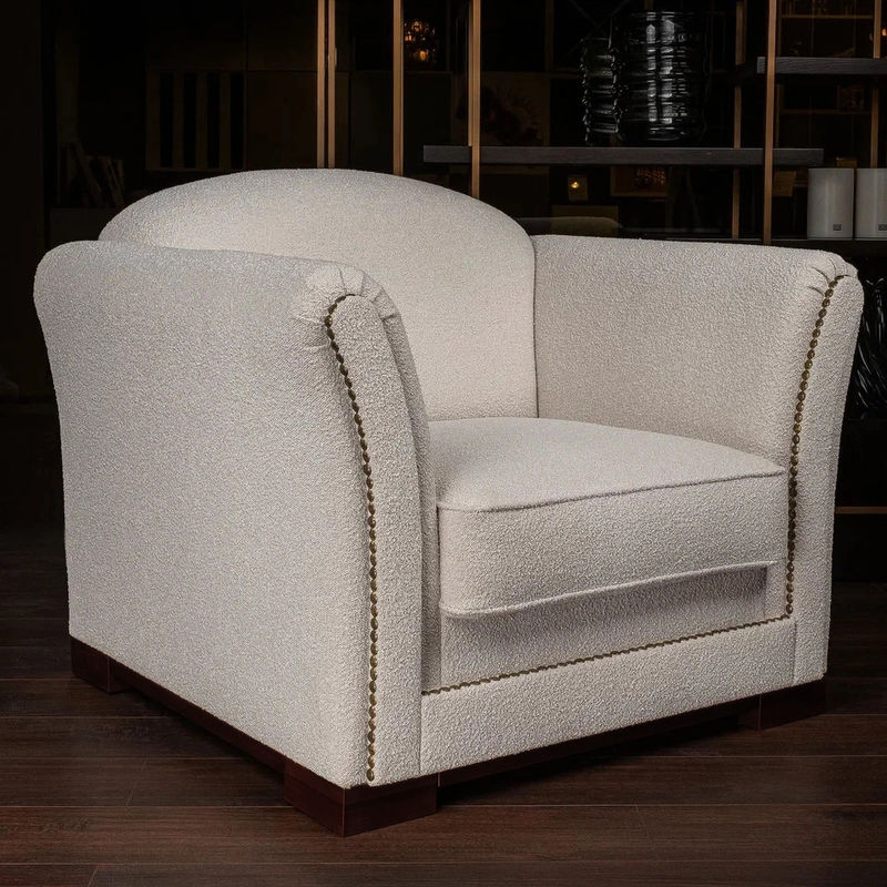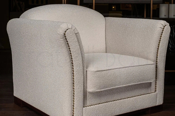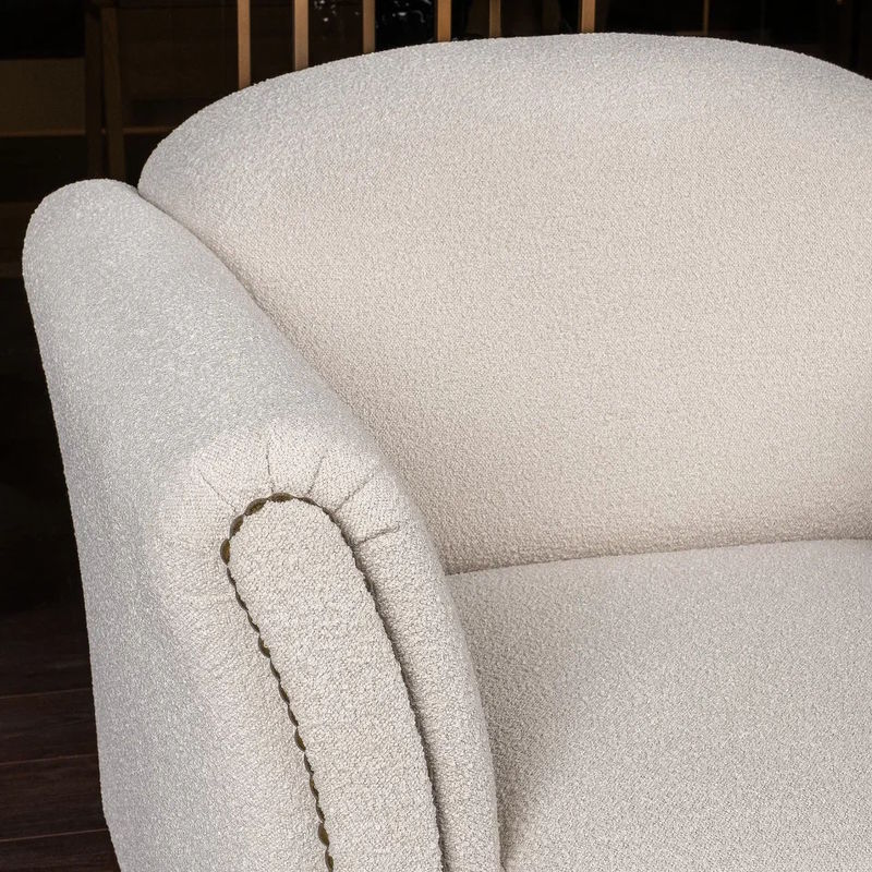 Обивка - ткань букле в светло-бежевых, почти белых тонах. Ножки из массива дерева, тонированы под орех.