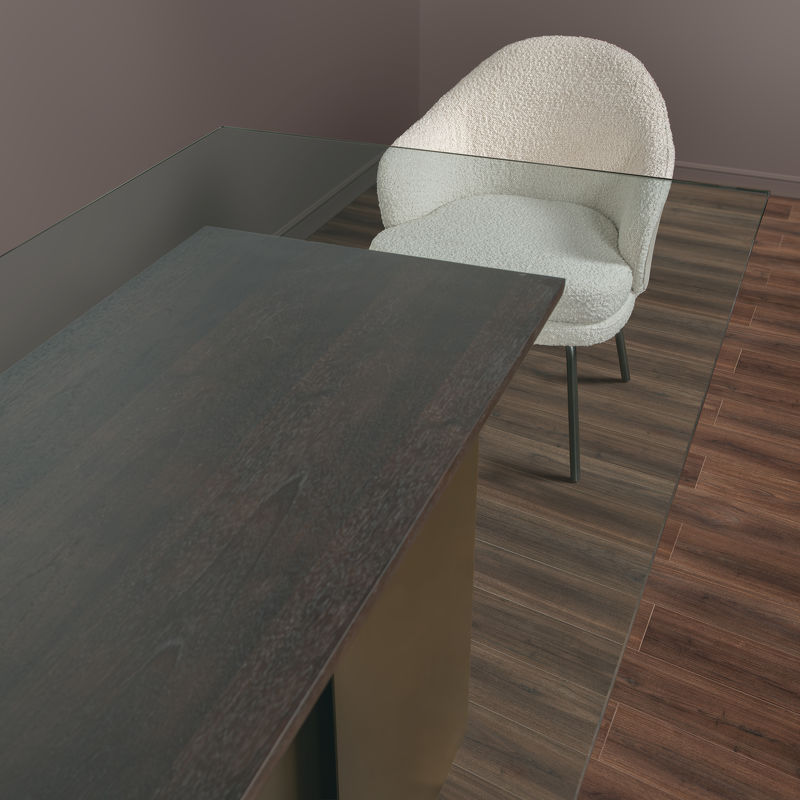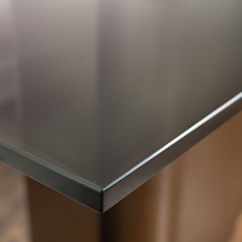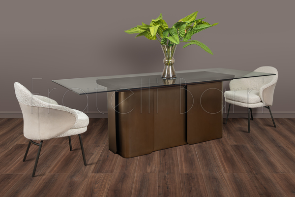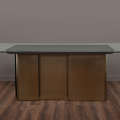 Столешница из прозрачного закаленного стекла толщиной 12 мм. Основание выполнено из высококачественного МДФ с отделкой из нержавеющей стали в цвете бронза.