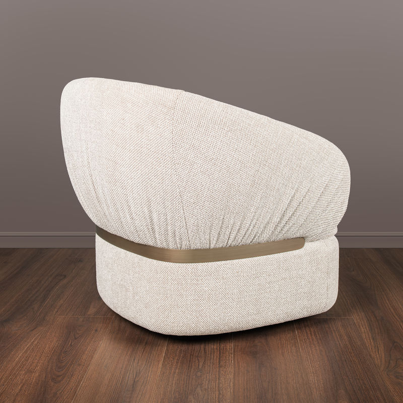 Кресло обито приятной тканью из ассортимента фабрики, акцентная деталь из нержавеющей стали в цвете матовая латунь. Каркас кресла деревянный, наполнитель пенополиуретан.