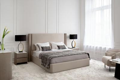 Кресло обито бежевой тканью из ассортимента фабрики, дополнено утонченными черными ножками. Каркас кресла из массива березы, наполнитель пенополиуретан.
