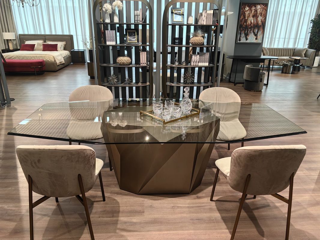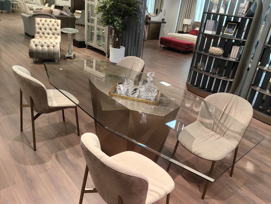 Столешница стола выполнена из прозрачного закаленного стекла. Основание - металл в цвете матовая латунь.
