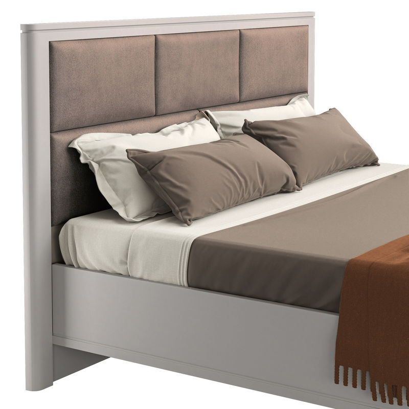 Мягкое изголовье обито тканью велюр в темно-бежевых тонах. Ткань украшена декоративной геометрической строчкой. Наполнение изголовья - пенополиуретан.