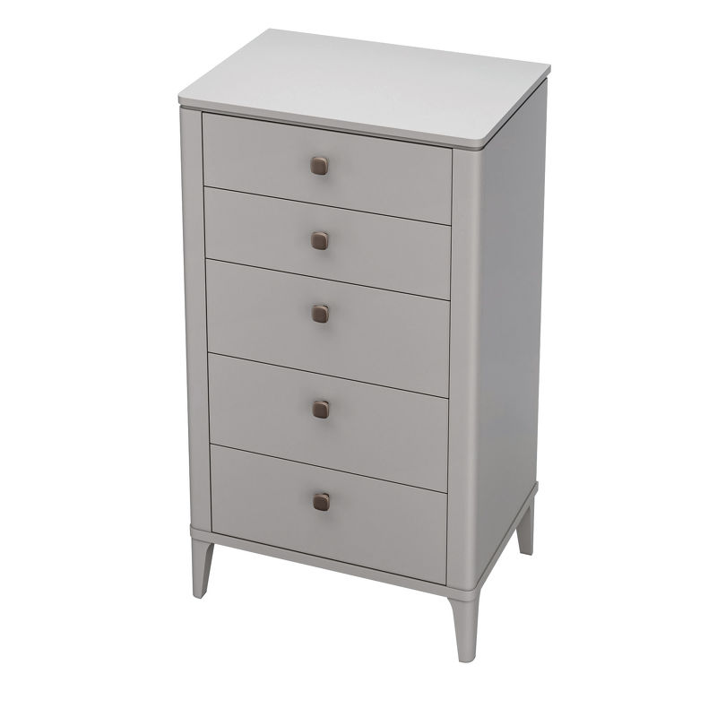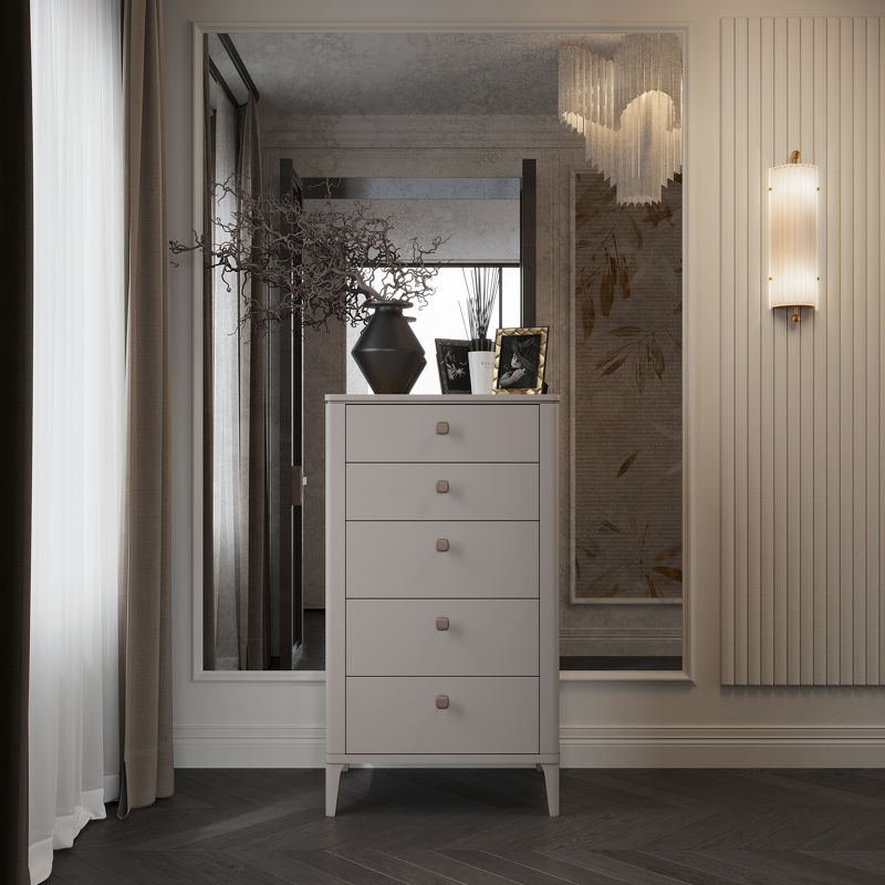 У комода 5 ящиков - 2 небольшой и 3 полноценной высоты. Ящики с направляющими скрытого монтажа и системой плавного закрывания soft closing.