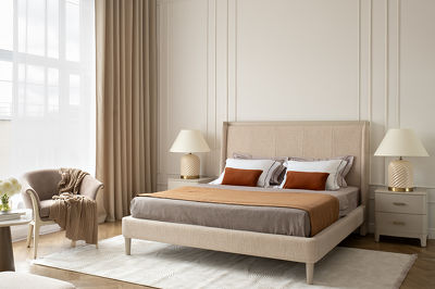 Изголовье и база кровати изготовлены из высококачественного МДФ, ножки - массив дерева. Обивка - ткань рогожка в бело-серых тонах. Наполнитель мягкой части изголовья и базы - пенополиуретан.