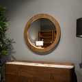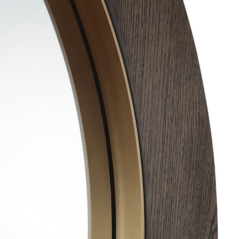 Рама зеркала выполнена из высококачественного МДФ, отделка - натуральный шпон высокосортного кронированного вяза, тонированного в теплый коричневый цвет. По внутреннему периметру рама дополнена кромкой в матовой нержавеющей стали в цвете латунь.