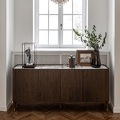 Буфет выполнен из высококачественного МДФ. Отделка - натуральный шпон высокосортного кронированного вяза, тонированного в теплый коричневый цвет. Столешница - керамика в бежевых тонах. На ножках колпачки из матовой нержавеющей стали в цвете латунь.