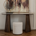 Консоль с акцентной овальной керамической столешницей, дополнена примечательными полукруглыми ножками в отделке натуральным шпоном вяза, с деталями из матовой нержавеющей стали.