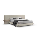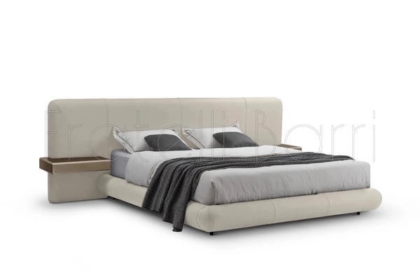 Двуспальная кровать с большим мягким изголовьем, оснащенным двумя выдвижными ящиками с каждой стороны, которую играют роль прикроватной тумбы.