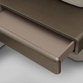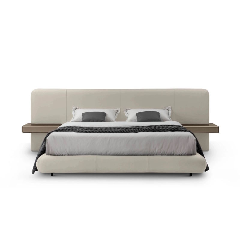 Двуспальная кровать с большим мягким изголовьем, оснащенным двумя выдвижными ящиками с каждой стороны, которую играют роль прикроватной тумбы.