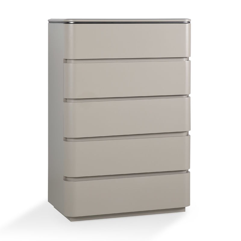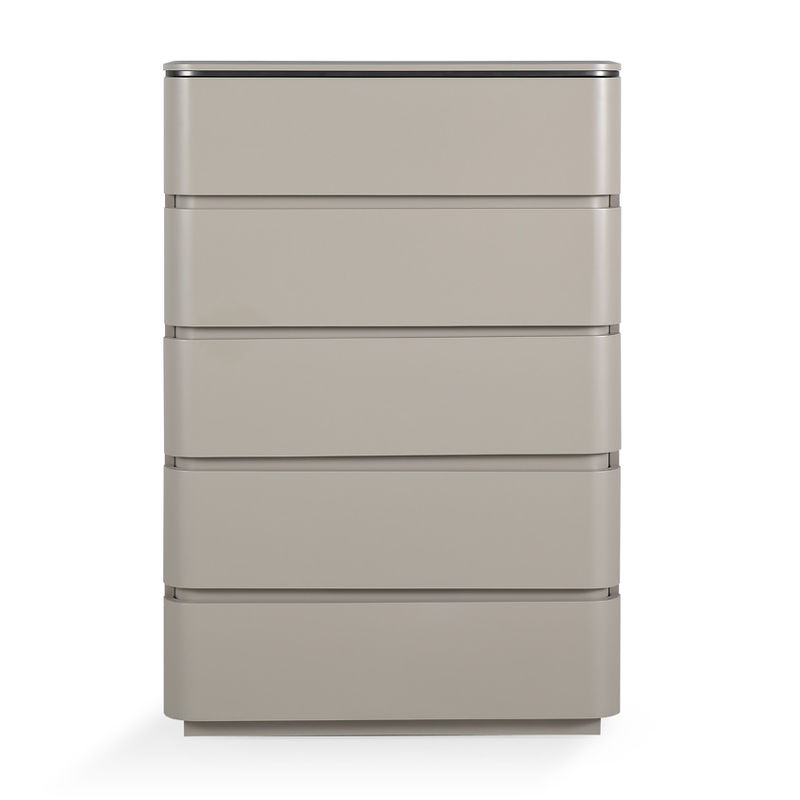Высокий комод с ящиками от бренда Fratelli Barri, выполнен в стиле минимализм. Комод изготовлен из высококачественного МДФ в отделке - матовый серо-бежевый лак, декоративная вставка - брашированный никель.