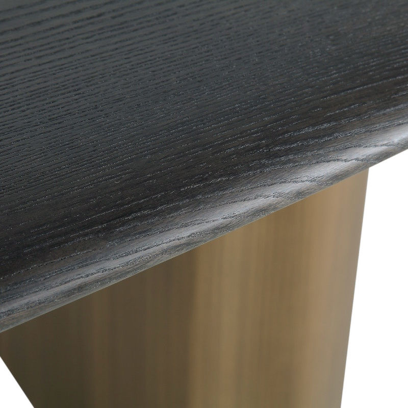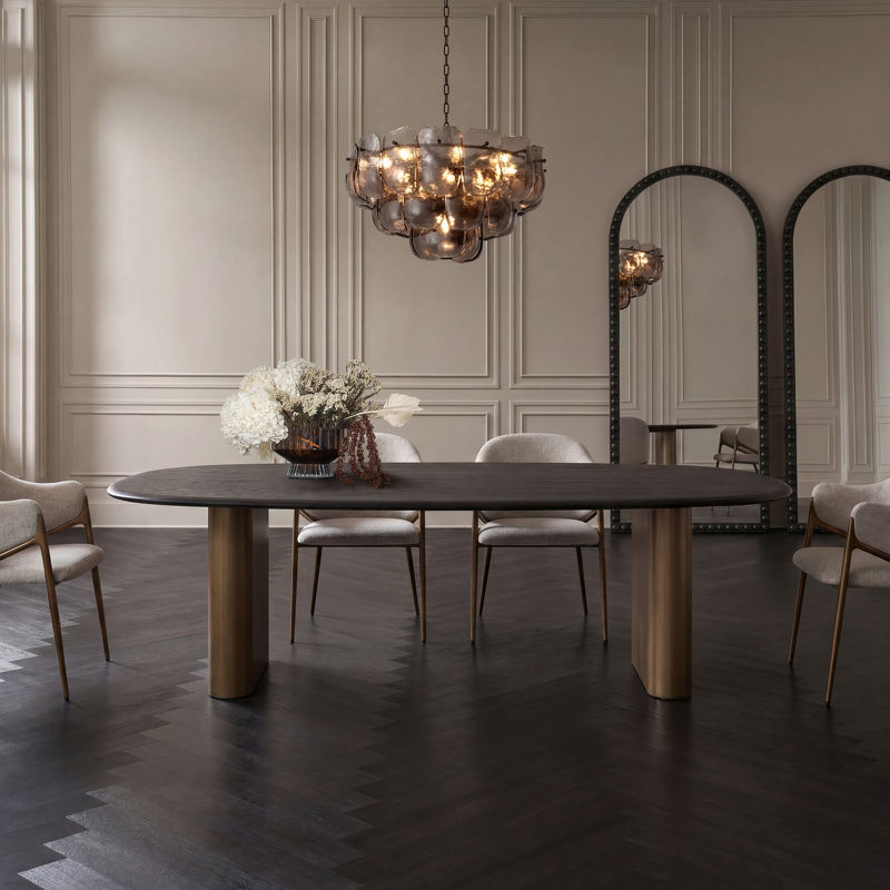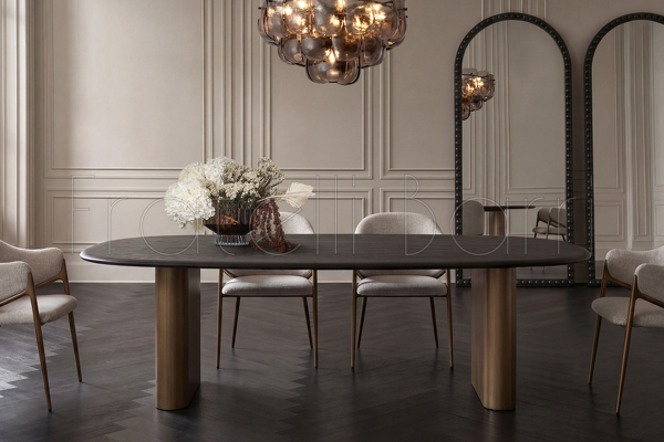 Благодаря внушительным размерам и благородному сочетанию тёплого шпона вяза с ножками в цвете латунь, стол задаёт тон всему интерьеру и становится его центром.