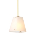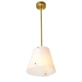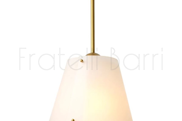 Плафон выполнен из белого матового стекла, детали и подвес в латунной отделке.