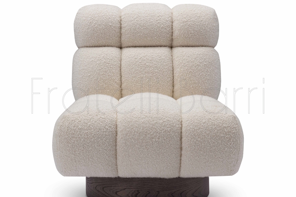 Кресло полностью выполнено в ткани на металлическом основании цвета латунь. Наполнитель - экологичный пенополиуретан.