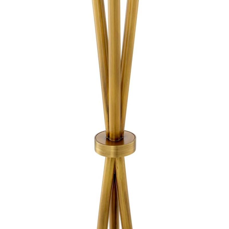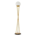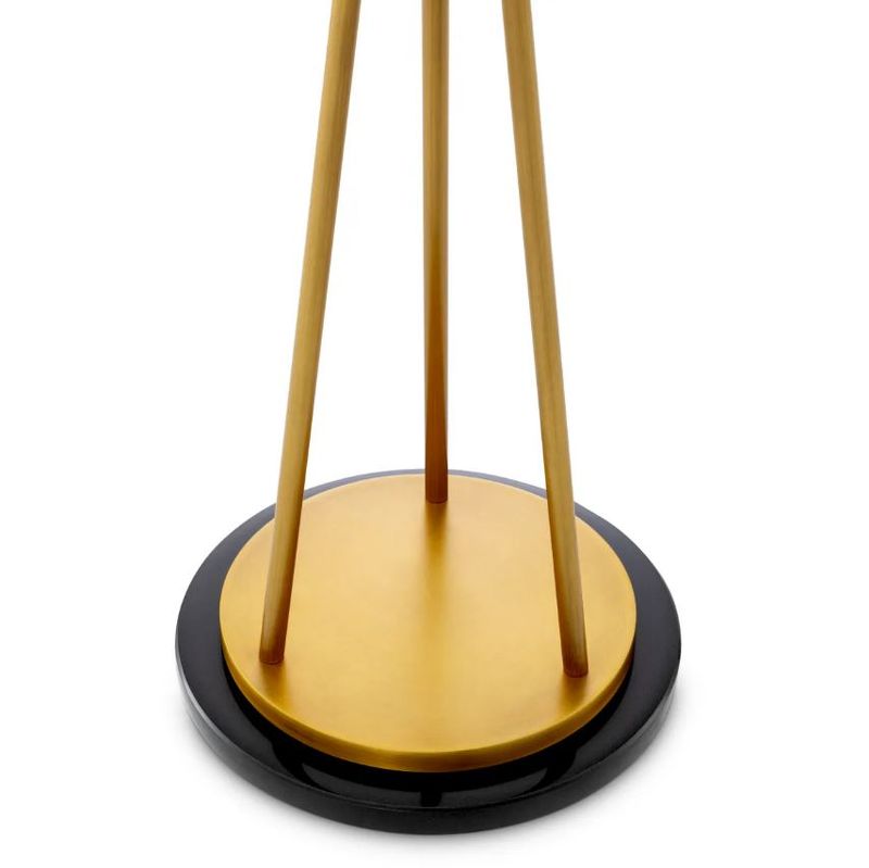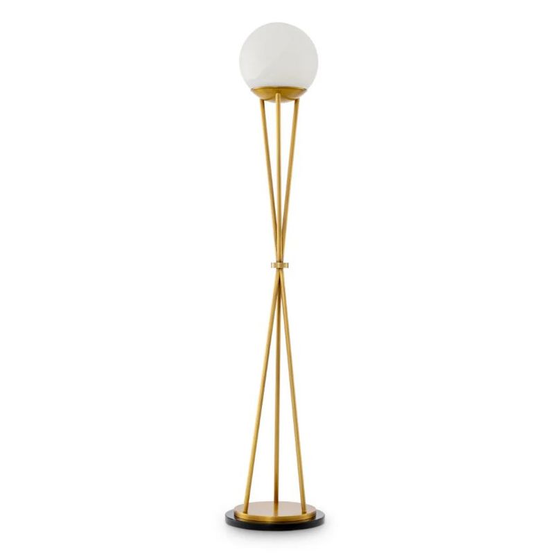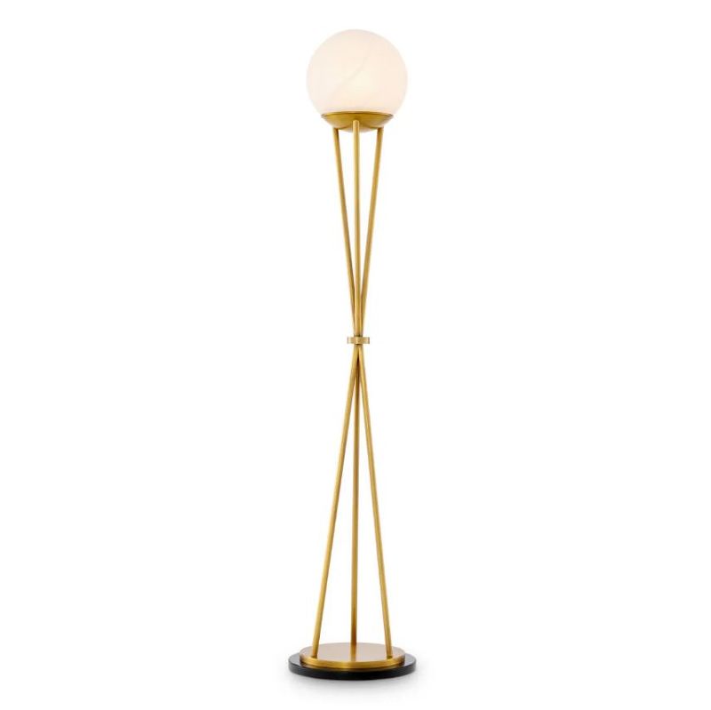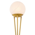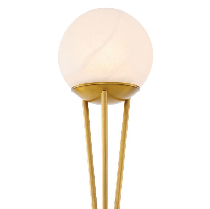 Светильник выполнен в виде треноги: три изящные латунные ножки сходятся в центре, удерживая круглый плафон из натурального алебастра. Алебастр — это природный материал, каждый кусок отличается по цвету, прозрачности и прожилкам. Матовый камень мягко рассеивает свет, создавая теплую и уютную атмосферу. Тяжелое основание из полированного камня надежно фиксирует конструкцию и добавляет композиции визуальной завершенности.