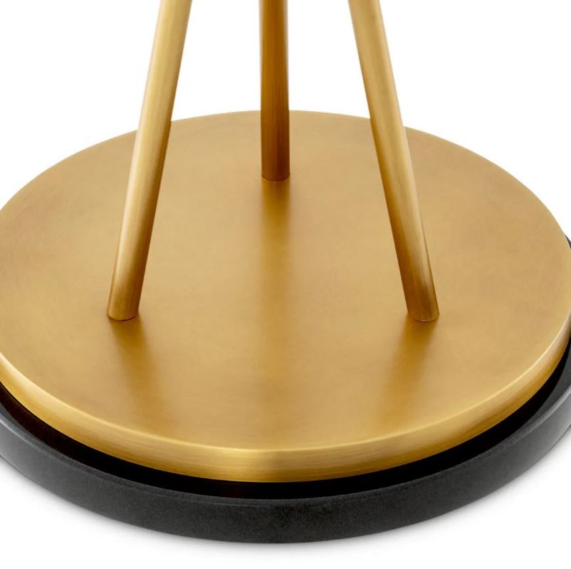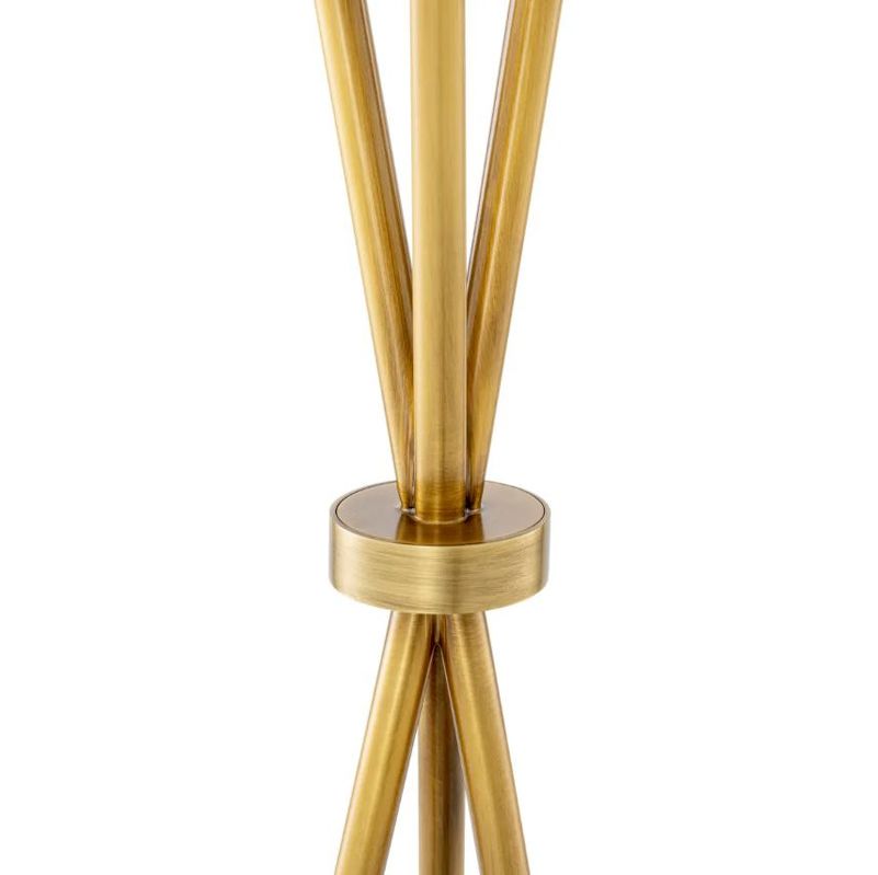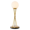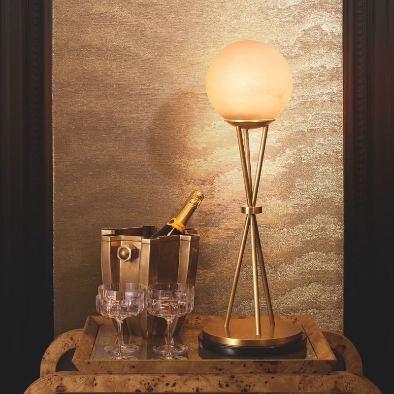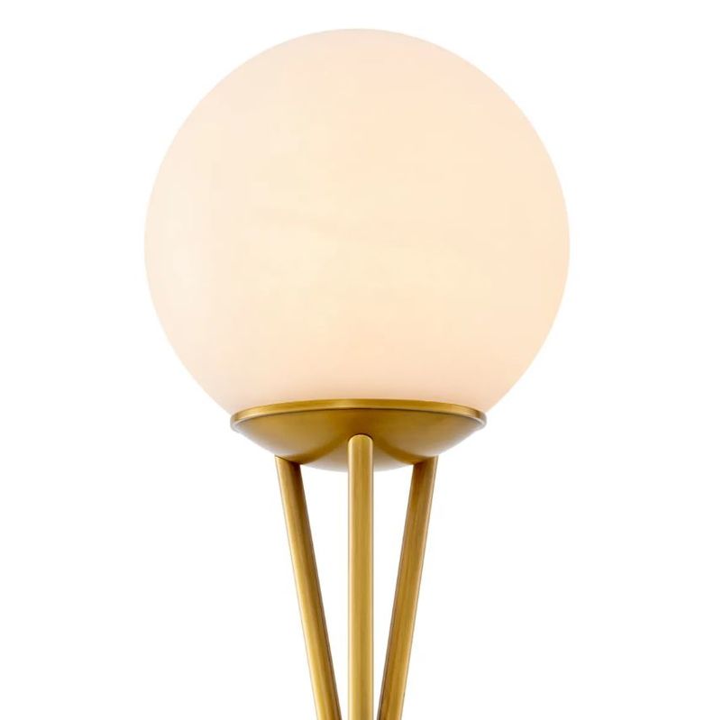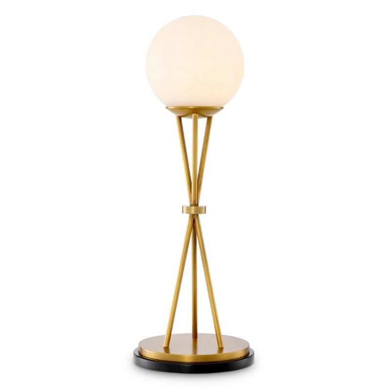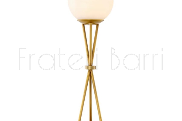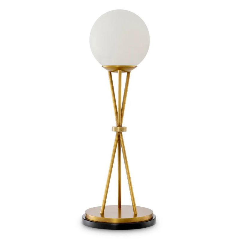 Алебастровая сфера, подобная полной луне, располагается на ажурном треножнике из полированной латуни. Три тонкие ножки пересекаются в изящном кольце, образуя выразительный графичный силуэт. В этом дизайне угадывается эстетика середины XX века, но исполнение остается вне времени и модных тенденций.