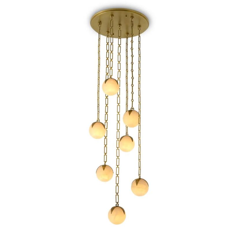 Каждый плафон вырезан из натурального алебастра с его неповторимым природным рисунком. Теплый блеск латуни идеально оттеняет нежные прожилки камня.