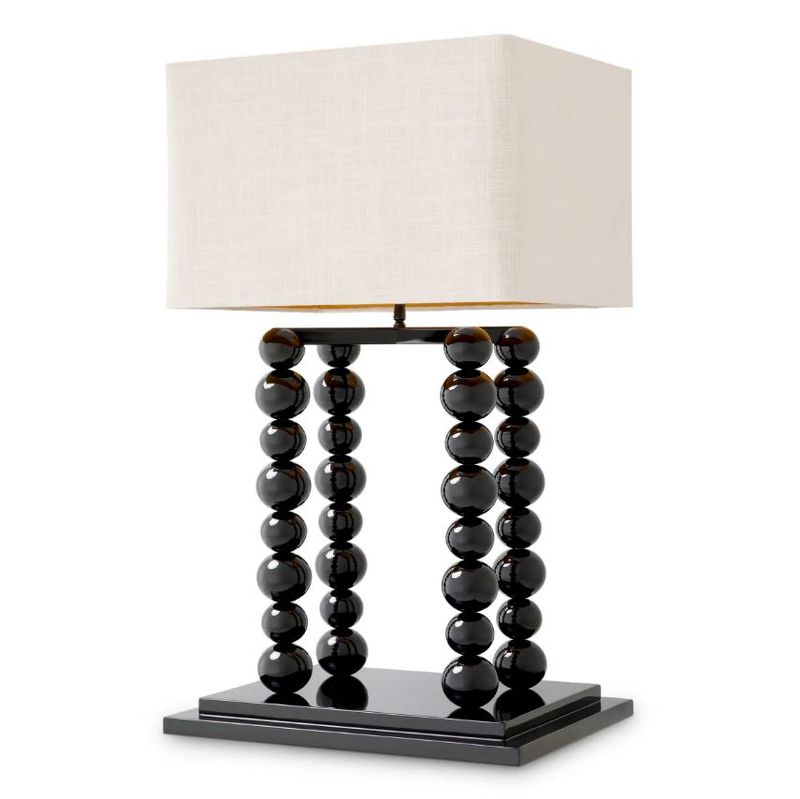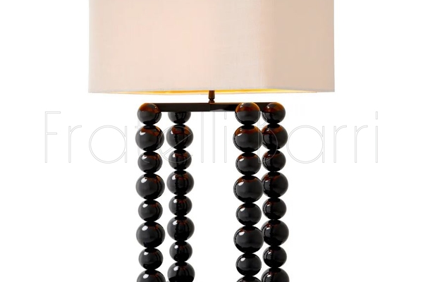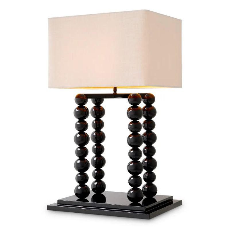 Четыре колонны из идеально отлакированных сфер: глянцевые черные шары выстроены в безупречном ритме, их отражающие поверхности захватывают и преломляют свет, создавая завораживающую игру бликов и теней. Эти орбические структуры служат постаментом для строгого прямоугольного абажура из белого льна. Чистая геометрия ткани контрастирует с тактильной, почти ювелирной фактурой основания, создавая напряжение между тяжелым и легким, матовым и глянцевым.
