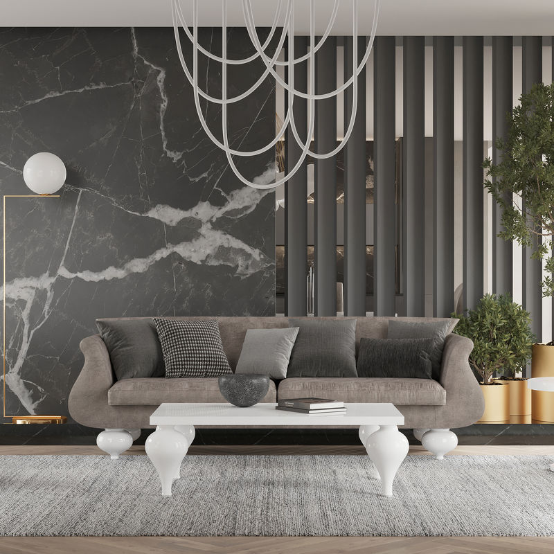 Диван, выполненный с элементами стиля ар-деко, поражающий воздушностью форм. Скрытая часть каркаса изготовлена из массива дерева, ножки оригинальной шарообразной формы покрыты глянцевым белым лаком. Объемные и идеально обтекаемые формы подлокотников великолепно сочетаются с декоративными подушками, украшающими спинку дивана.