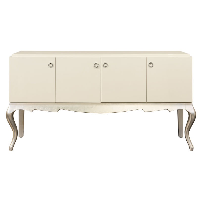 Прямые детали корпуса выполнены из МДФ класса Е1. Ножки и резная база - из массива дерева. Ручки круглые, цвет - хром.