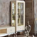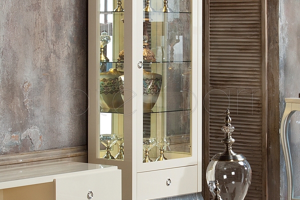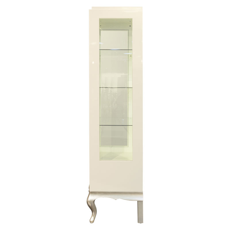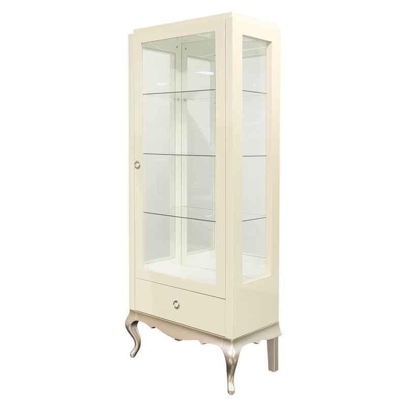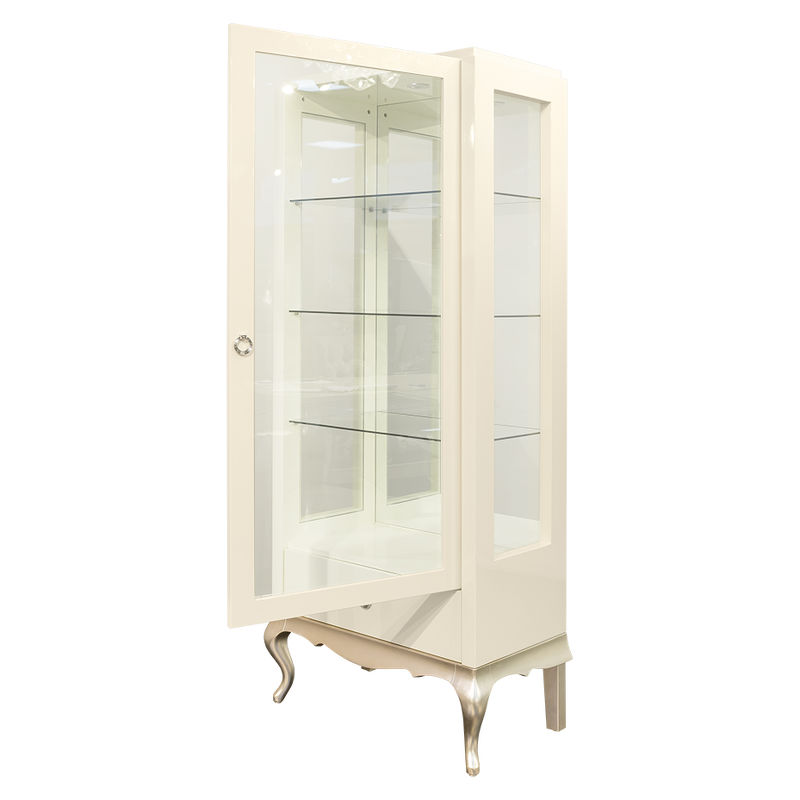 1 распашная дверка. Боковины и дверки с закаленным стеклом. Задняя стенка внутри зеркальная. 1 выдвижной ящик в нижней части оснащен системой плавного закрывания. Внутреннее наполнение - 3 полки из закаленного стекла. Полка выдерживает нагрузку до 8 кг. Петли справа. Подсветка - 1 точечный светильник. Передние ножки изогнутые, задние - прямые, что позволяет поставить витрину плотно к стене.