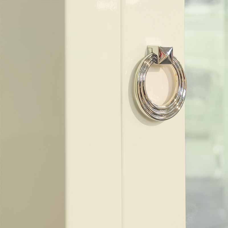 Прямые детали корпуса выполнены из МДФ класса Е1. Ножки и резная база - из массива дерева. Ручка круглая, цвет - хром.