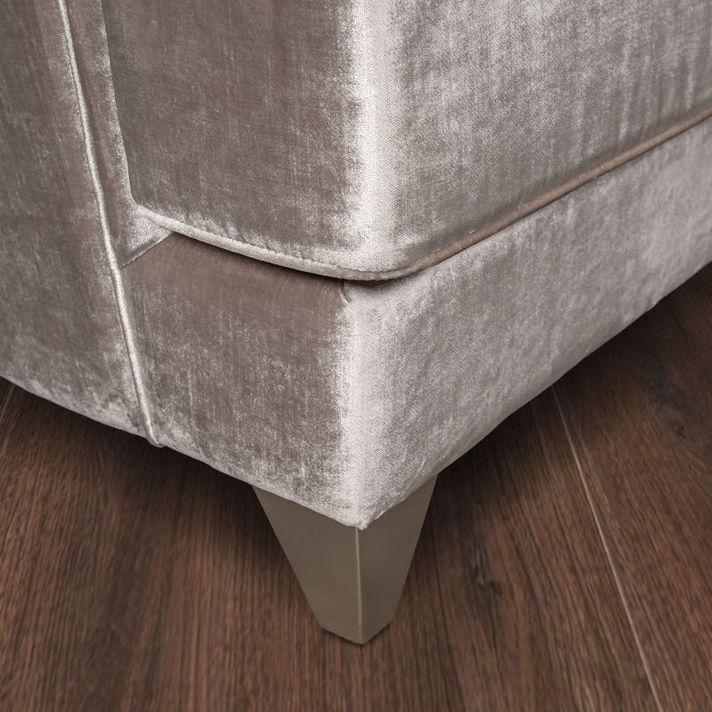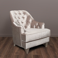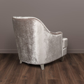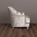 Каркас — натуральный массив дерева, отделка (ножки) — серебристое напыление, обивка — серо-серебристый велюр. Спинка и частично подлокотники декорированы стежкой капитоне.