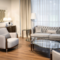 Кресло выполнено в стиле Ар-деко. Каркас изготовлен из массива бука. Сидение на эластичных ремнях, наполнитель пенополиуретан. Детали выполнены из нержавеющей стали с хромированным покрытием и мрамора.